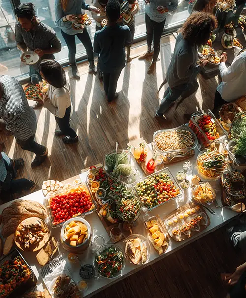 Dazu gibt es frische Salate, gebackene Drillinge mit Rosmarin, Wildreisbeilagen und vieles mehr. Da ist für jeden was Gutes dabei.